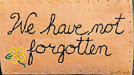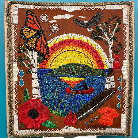 Sandra titled her work, "We Have Not Forgotten." She designed the Legacy Piece with images that include motifs from the makakoon, a canoe and other images from each of the six Mississauga Nations logos, an orange shirt to remind us of residential schools and their legacies, a poppy to honour veterans, an orange shirt reminding us of children who went to residential schools, and a red dress reminding us of missing and murdered Indigenous women. She also included the view of beautiful Rice Lake that she sees from her house. On the birch tree at right, she has included the initials LB and LP, to honour the THR co-curators Lori Beavis and Laura Peers.